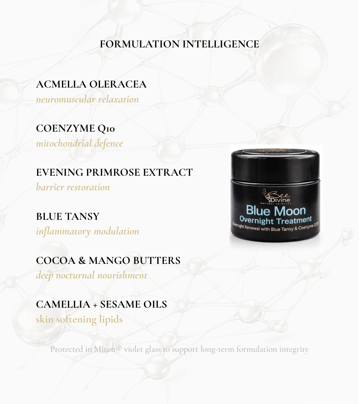 Blue Moon acts as an intelligent overnight seal, locking in moisture and actives beneath it while supporting the skin’s natural nocturnal repair processes.