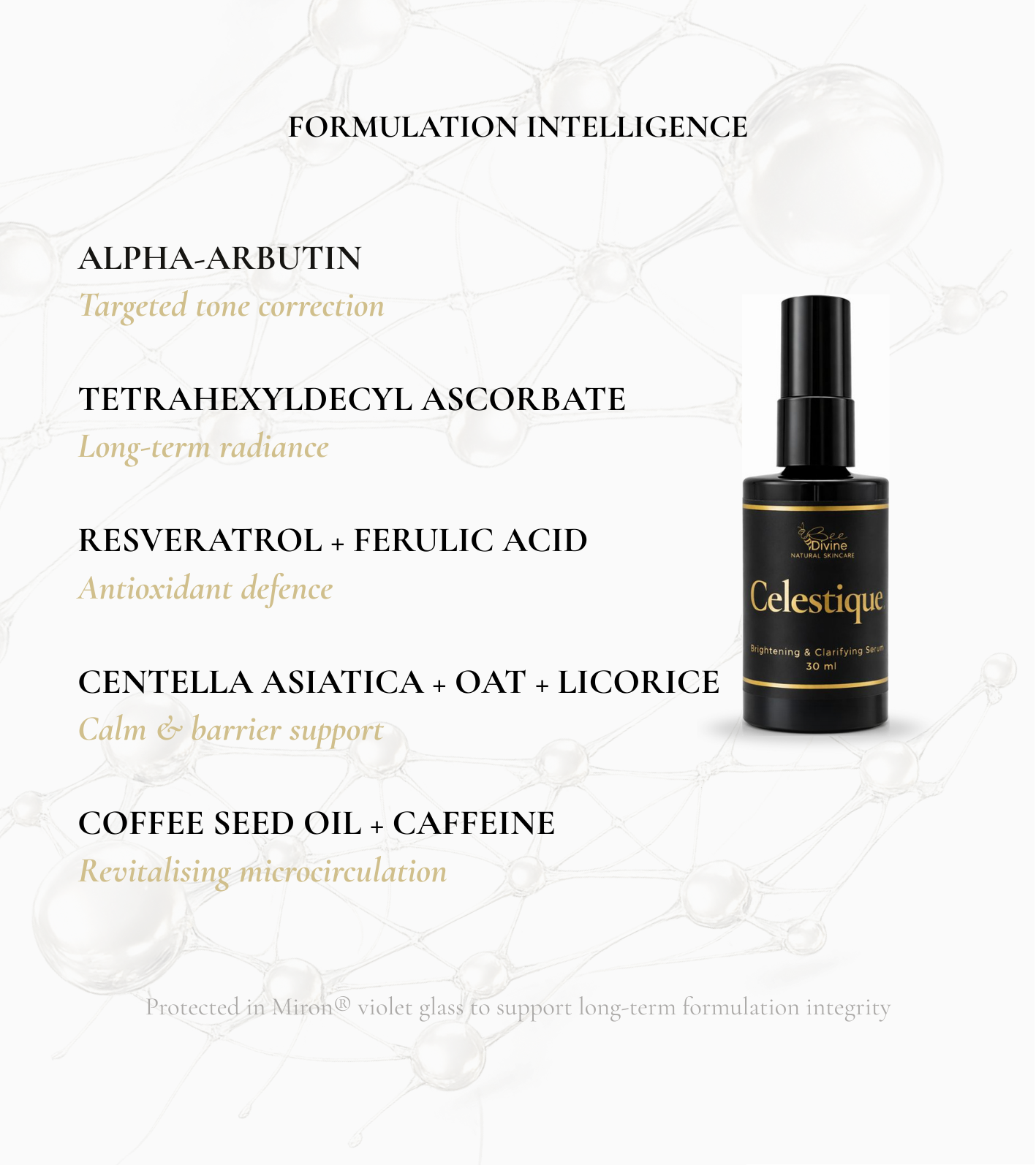 Celestique is a precision-engineered brightening and clarifying facial treatment designed to correct uneven tone, calm inflammation and strengthen skin resilience at a cellular level.